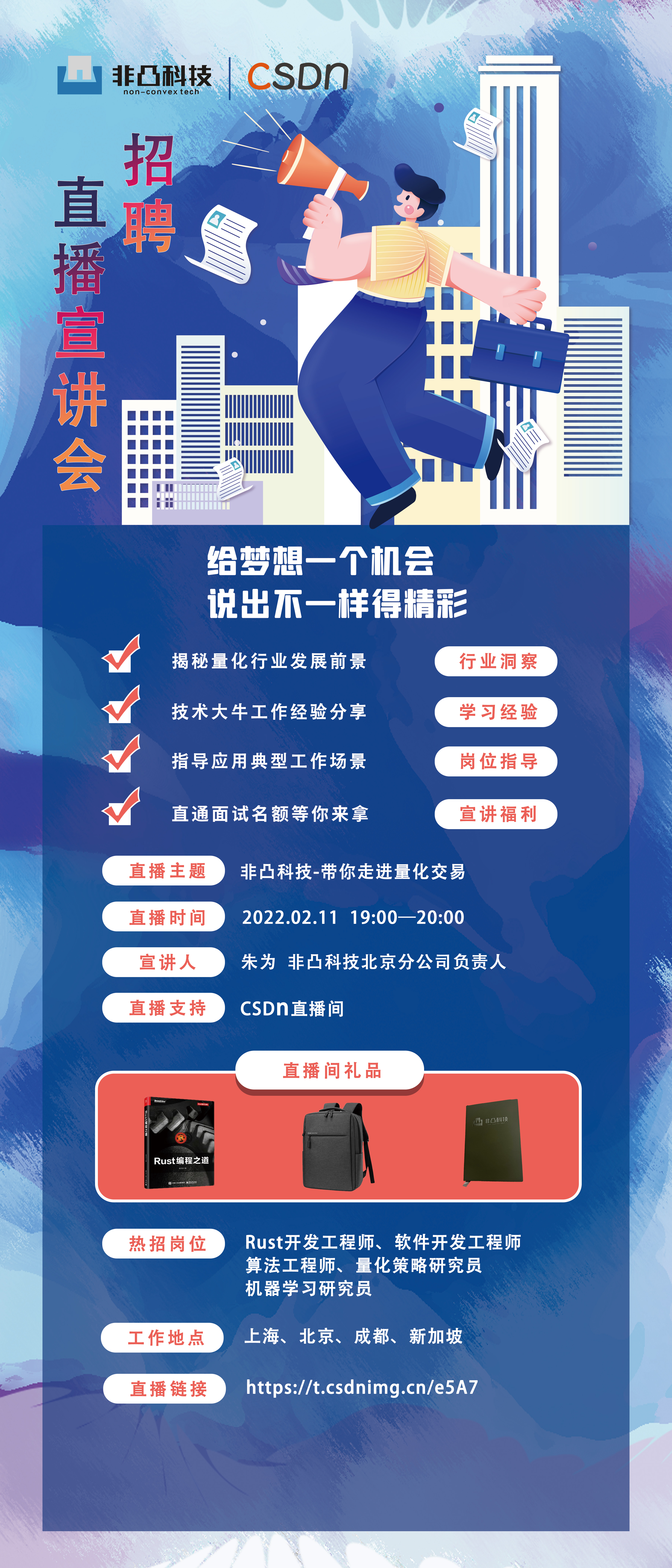 直播主题:非凸科技-带你走进量化交易直播时间:2月11日(本周五)19:00-20:00宣讲人:朱为-非凸科技北京分公司负责人直播支持:CSDN直播间直播链接:https://t.csdnimg.cn/e5A7直播内容:(1)非凸科技公司介绍(2)非凸智能算法和系统(3)非凸招聘岗位企业介绍:上海非凸智能科技有限公司(简称“非凸科技”)成立于2018年,是国内领先的智能算法和交易系统服务公司,专注于智能算法交易领域的研究和开发。公司正基于Rust生态,结合机器学习和深度学习等新兴技术,打造高效率、低延迟、高可靠、全内存高频交易平台,为券商、量化私募等众多大型金融机构提供优质的算法服务。我们全明星团队均来自海内外知名院校及头部科技/金融/互联网公司,多数成员拥有国际竞赛奖牌,具备迅速迭代并应用最新技术的能力。